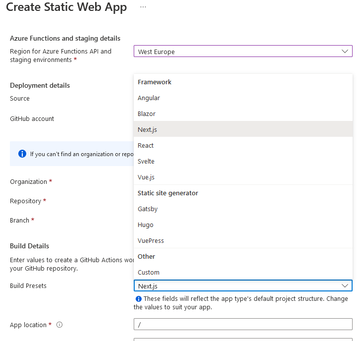 Make sure you select the appropriate build preset for deployment. I have Next JS APP, so I have selected it below. There are many options as shown below