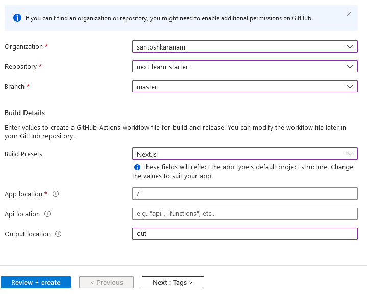 Once signed in, you will get below option to select the git hub repository where the nextjs web app code is present.