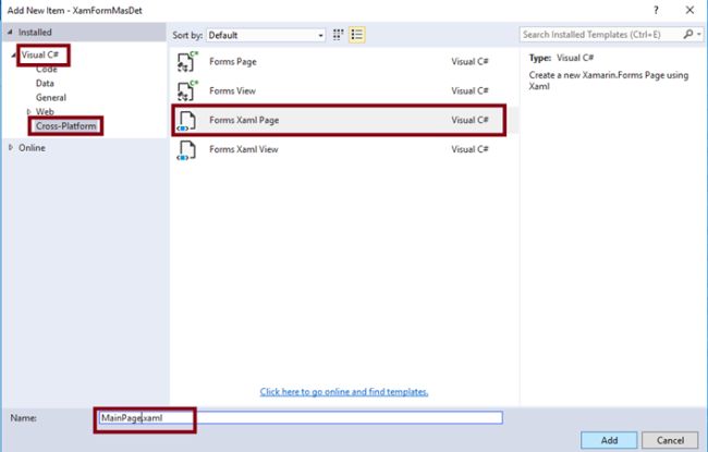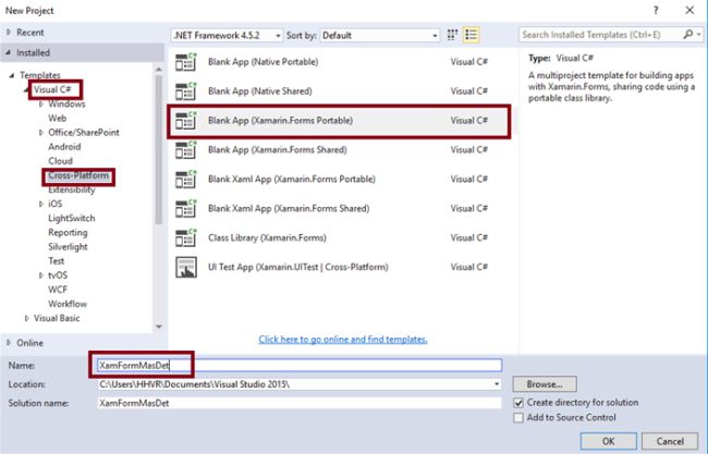 Open Visual Studio 2015 -> Start -> New Project-> Select Cross-Platform (under Visual C#-> Blank app (Xamarin.Forms Portable)-> Give the suitable name for your app (XamFormMasDet) ->OK.