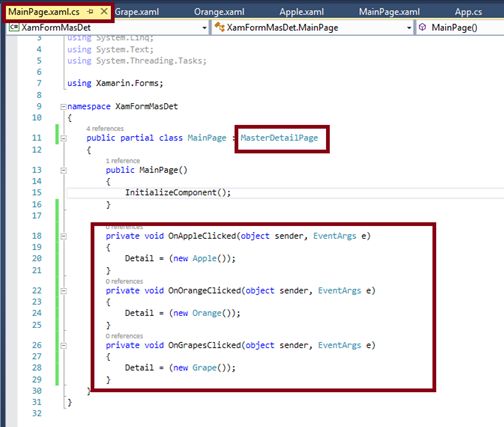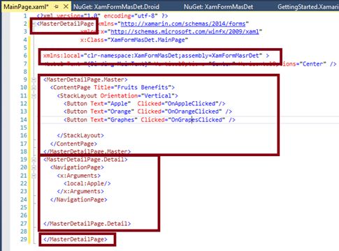 In MainPage.xaml, change the content page as master detail page and add xmlns.local reference Add MasterDetailPage.Master and MasterDetailPage.Detail with Button and Label.