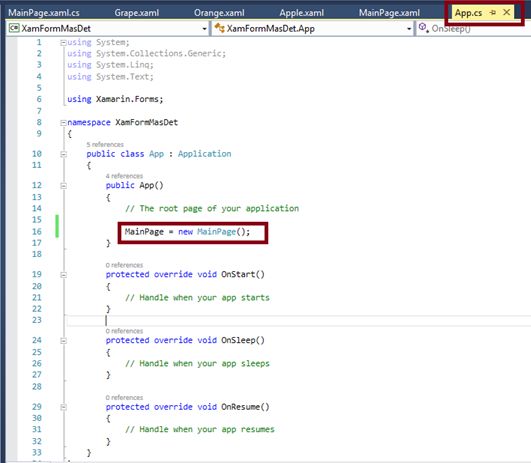 Open (double click) the file App.cs in the Solution Explorer-> XamFormMasDet (portable) and set the Root page.