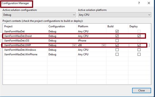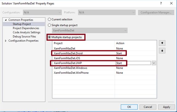 We will test Android and UWP. Thus, we can set the Multiple Startup Projects as XamFormMasDet.Droid and XamFormMasDet.UWP (Universal Windows).