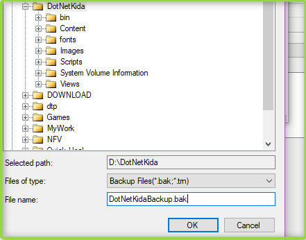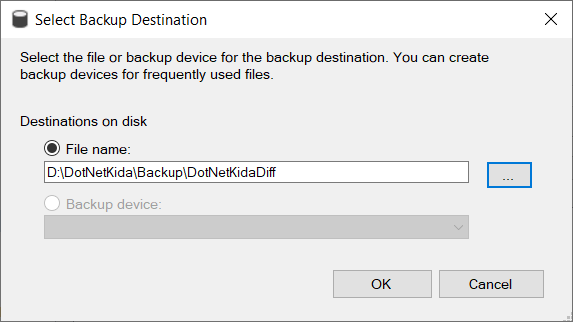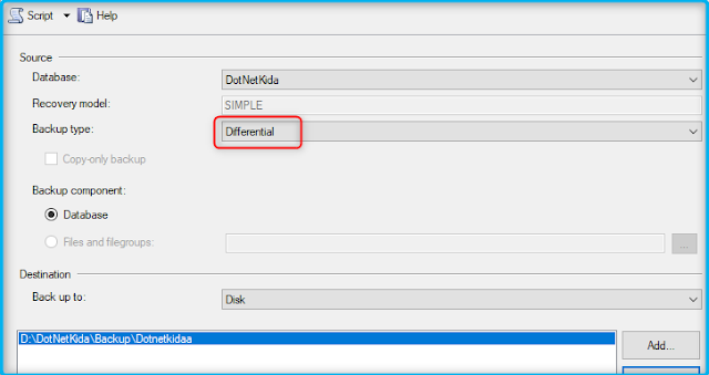 BACKUP DATABASE DotNetKida TO DISK='D:\DotNetKida\Backup\DotNetKida.DIF' WITH DIFFERENTIAL