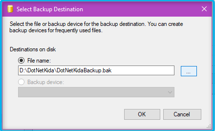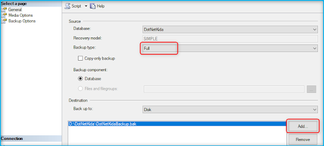Select Full as Backup Type, select Disk as the destination, and then click on Add button to add the directory where the backup will be stored on your disk.