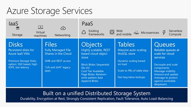 - In addition, Azure storage also offers Azure Services, which bridges your datacenter to Cloud like StorSimple, Azure Backup, Azure Site Recovery.