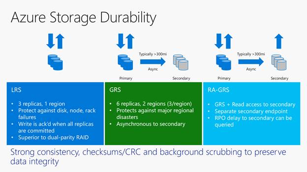 - LRS or Locally Redundant Storage, which has 3 replicas, 3 disks on 3 different racks in a single region, which protects against the failures at that level. the client never has to think about the traditional forms of backup such as RAID. You may still need backup for other things but for HW failures, it is no longer necessary.
