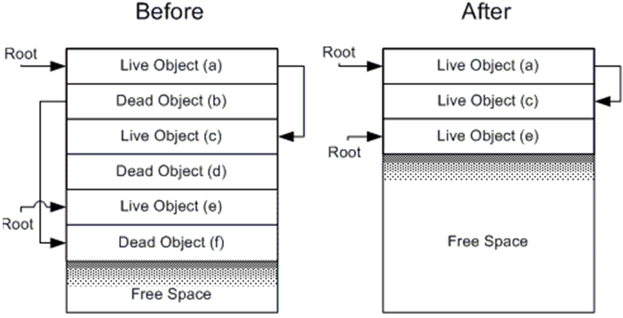 - Periodically the heap is compacted by removing dead objects and sliding the live objects up toward the low-address end of the heap. This expands the unused area at the bottom of the diagram in which new objects are created.