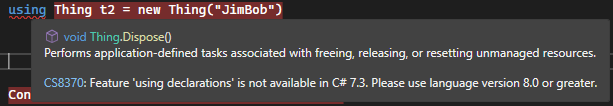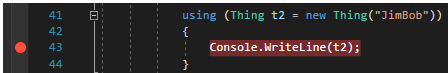 When declared in a using declaration, a local variable is disposed at the end of the scope in which it's declared. In the preceding example, disposal happens at the end of a method (see the different workflow).