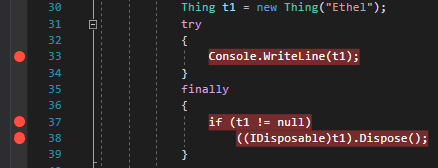 where IL_0029 is the code Line 41 starting the using block; while IL_0034 to IL_0049 is the equivalent try...finally block in IL.