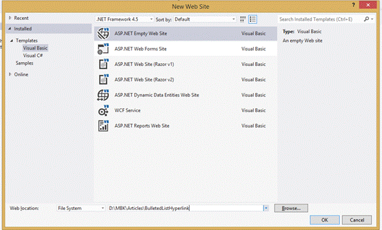 Create an ASP.NET empty Web site project named “BulletedLIstHyperlink”
