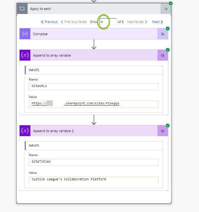 Note the numbers highlighted in the circle in below screenshot. Currently, we are seeing the first element of the array and the total items are 6. This means that I would have a total of 6 site collections created in my tenant.