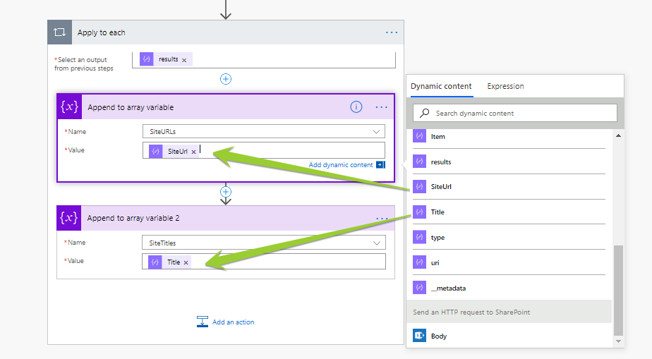- Select 'SiteUrl' in one and 'Title' in second as a value from dynamic content.
