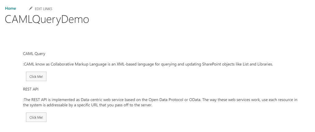 - htmlVal += items[i].Title + "<br/><br/> :" + items[i].Description + ' <br/><br/><button type="button" onclick="getUsingCAML(\'' + items[i].ID + '\',\'' + items[i].Description + '\')">Click Me!</button> <br/><br/><h3 id="' + items[i].ID + '"></h3> '; //ID sets as dynamic value
