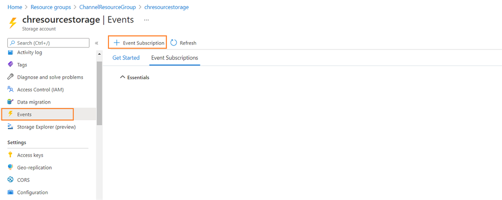 here. Once the storage account is ready, one can click on Events as shown below and can create a subscription,