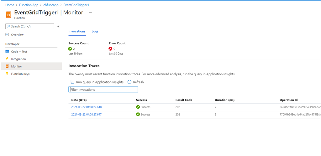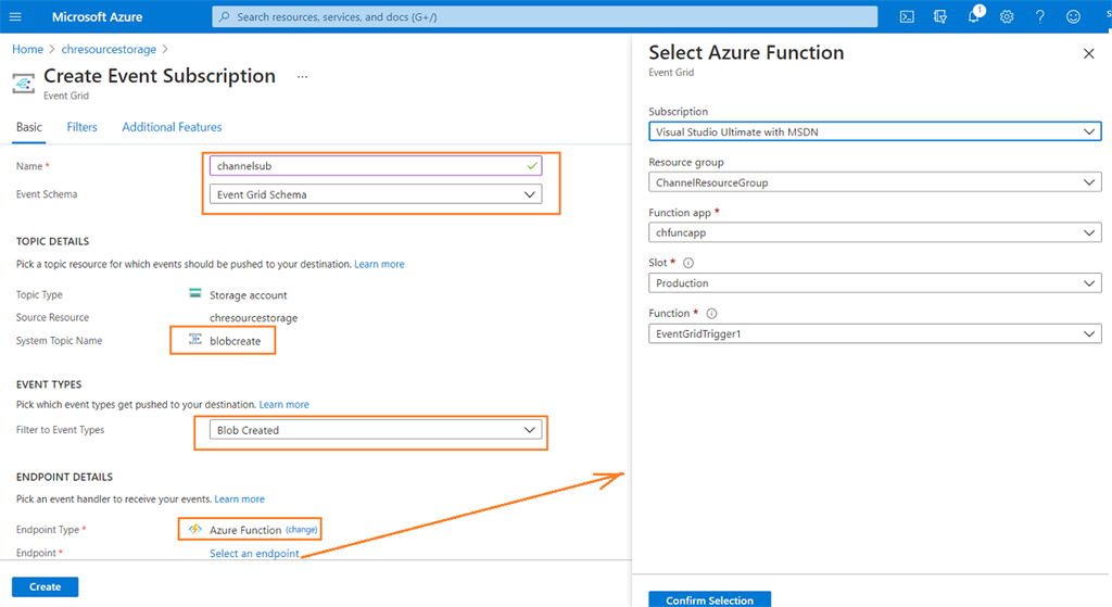 In this example, we just want to monitor when a file is uploaded to Azure storage and that’s the reason, we selected Event Type as Blob Created. Click on Create and you will notice that our new subscription is listed under Event Subscriptions.