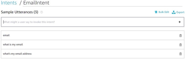 Here, I have added a new intent named EmailIntent along with some sample utterances such as email address, what’s my email address, and what is my email. No slots and custom slot types are defined for this Alexa skill.