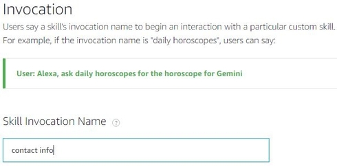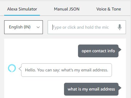 As we can see from the output above, to invoke a skill, the user can say open followed by invocation name. Here contact info is an invocation name to invoke this skill. Once the skill is invoked, Alexa greets the user by saying hello and tells the user to say what my email, so that Alexa can fetch and provide the user’s email address.