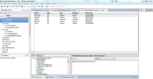 Create a simple form in Lotus Notes to save the records in Lotus notes database. Here, I have created the database "Migration.nsf" and created a form "StudentInformations" to save the student details in Lotus notes.