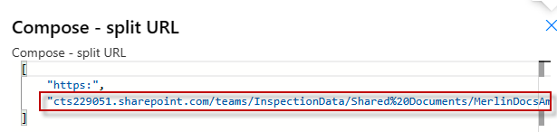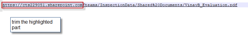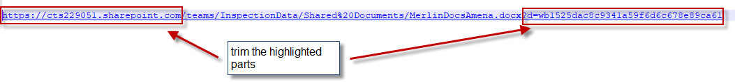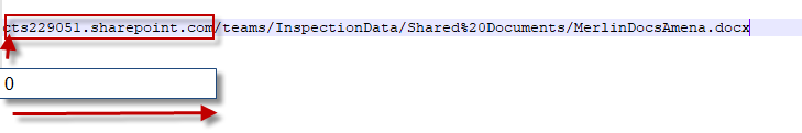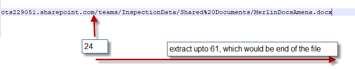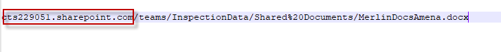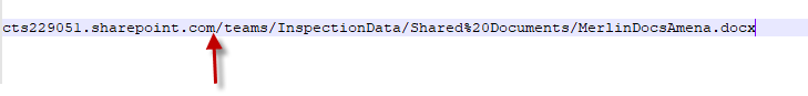 Total Length of second part variable: 85 (length of “cts229051.sharepoint.com/teams/InspectionData/Shared%20Documents/MerlinDocsAmena.docx”)