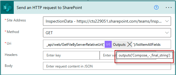 Step 16 - Configure the HTTP request action. Since we are using API GetFileByServerRelativeURL’ substitute the relative URL with outputs of 'Compose_Final_st’ing' action from above steps. For example it woulld be in simiar format to ‘/teams/InspectionData/Shared%20Documents/MerlinDocsAmena.docx’