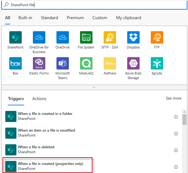 Step 4 - Search for the trigger with text ‘SharePoint file’ and then select the trigger ‘When a file is created (properties only)’.