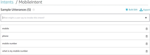 Here, I have added a new intent named MobileIntent along with some sample utterances such as mobile number, what’s my mobile number, and what is my mobile number. No slots and custom slot types are defined for this Alexa skill.