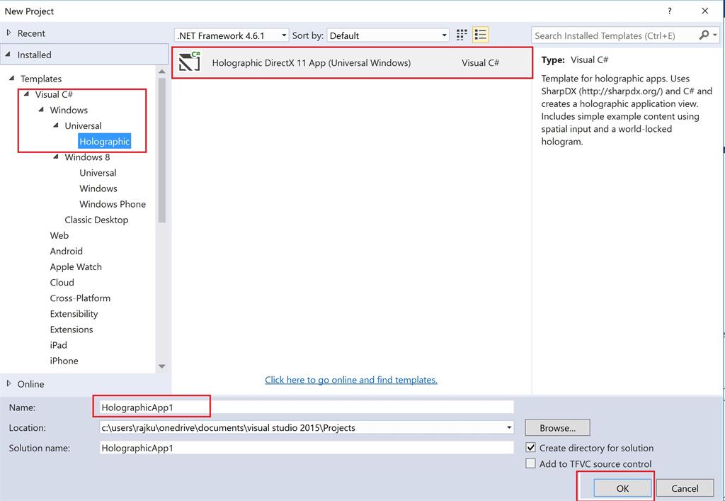 - Click Visual C# and Windows and Universal then select Holographic