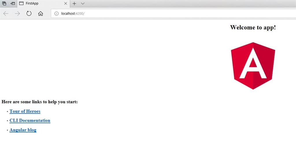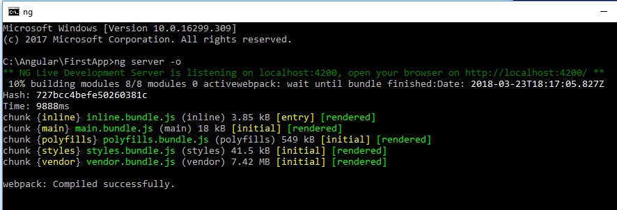 Now open FirstApp folder & using command prompt type the below command which will compile your application and open it in browser. Here use -o for opening:
