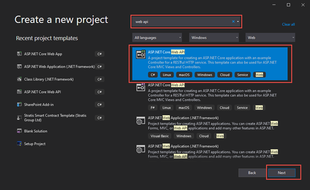Then, we will choose the project template ASP.NET Core Web API as portrayed below.
