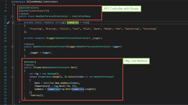 In the controller class, we define API controller, Route, and HTTP methods as the shown sample.