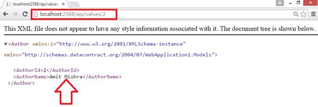 Now try another Get() method, put id==1 in URL, so you’ll get Author, which has AuthorId=1 is return.