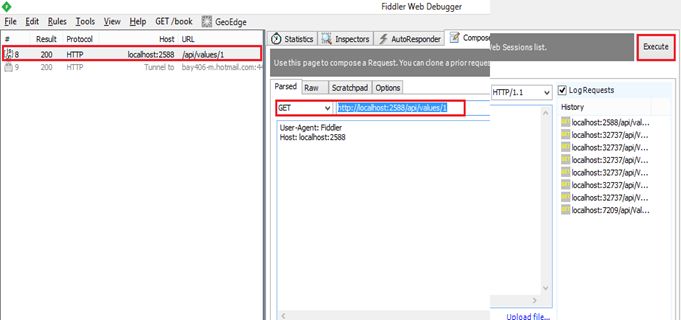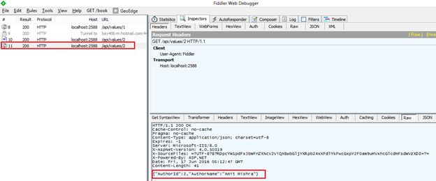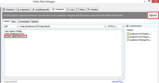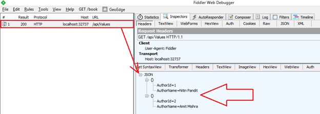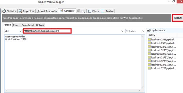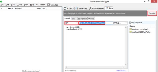 Here is the screenshot of fiddler, we try to make Get request and pass the Web API URL in URL tab under the composer after that simply click on to execute button in the top right side of the window.