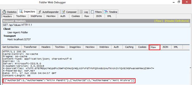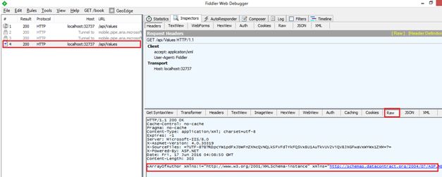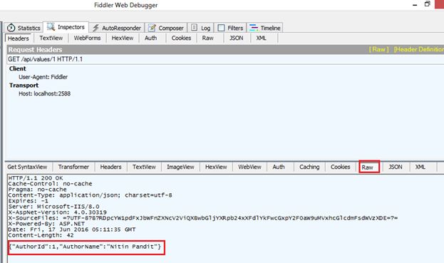 In the right side of the window, click on the raw tab where you can find JSON representation of our string data. You’ll remember when we make requests using Chrome we get XML representation of our string data, whereas in the case of Fiddler we’re getting it in JSON