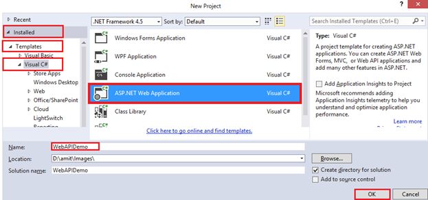 Expand Installed > Templates > Visual C# and choose an ASP.NET Web Application from the menu, give a name to your Web API project and finally click on the “OK” button.