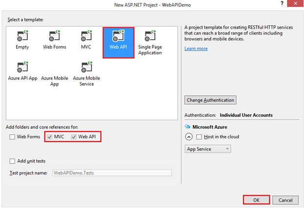 So select a template. I’m going to create a Web API, so select a Web API template from the list of templates. Click on the ok button to create a Web API project including MVC features.