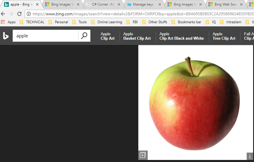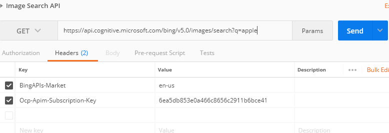 - Install postman and let’s try out this API and try to search any image. For that, paste the URL at postman and provide the request headers and the key. You can paste what you grabbed in previous steps and mention the query string. Here, I mentioned – apple.