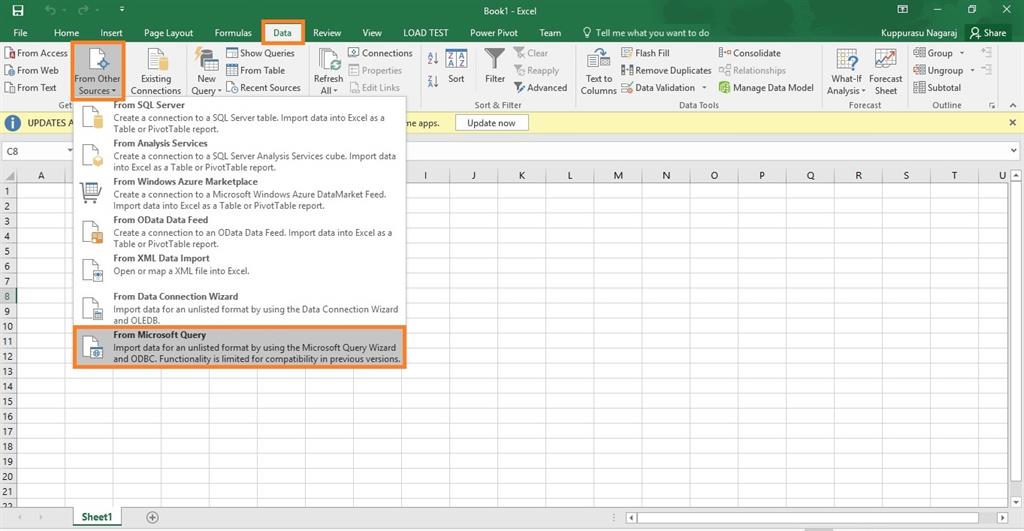 - Click the "Data" menu, click "From Other Sources", and then click "From Microsoft Query".