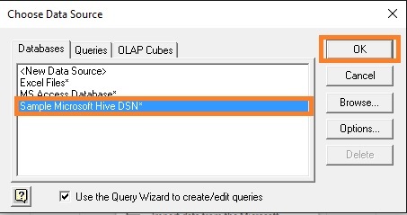 - Next we will get Choose Data Source window and select Sample Microsoft Hive DSN* Option and Click OK Button.