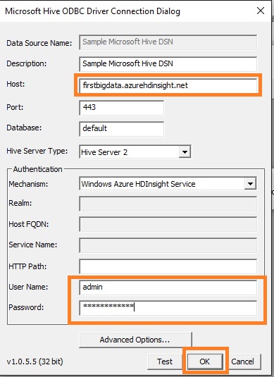 - Now we will get Microsoft Hive ODBC Driver Connection Dialog window, and enter Host Address, User Name and Password. After that click OK Button.
