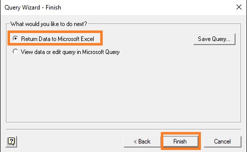 - Finally Choose Return Data to Microsoft Excel option then Click Finish Button.