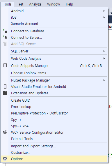 Open Visual Studio 2015 and at the top from Tools menu, select Options.