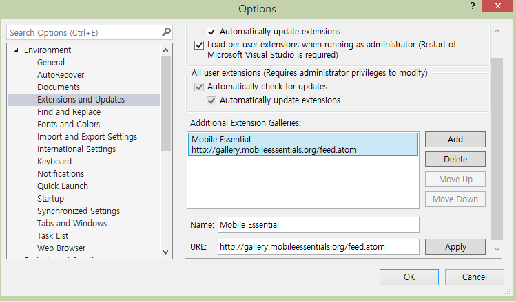 We can see our Options Window has been opened .Click “Extensions and Updates”. If Mobile Essential is not added, click Add, in name, we can give “Mobile Essential” and in URL, give the URL as http://gallery.mobileessentials.org/feed.atom. Click OK.