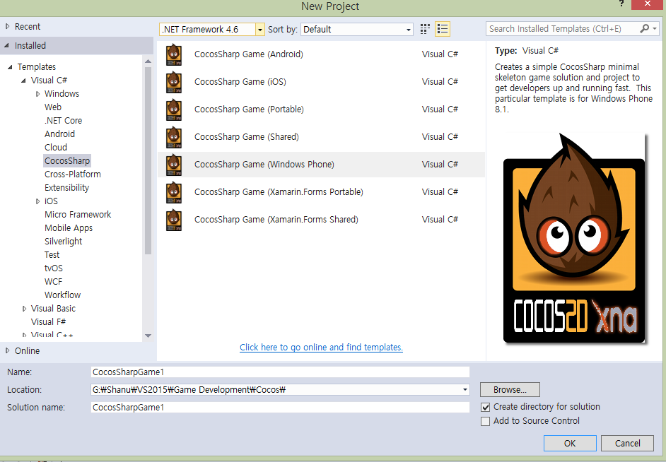After Installation, open Visual Studio 2015, click create new project and select CoCosSharp from the left side templates. Select your CoCosSharp Development as Android, iOS or Windows. In our example, we will be using for Windows Phone.
