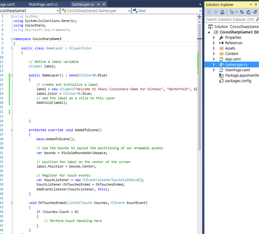 GameLayer is the main Ccass of CocosSharp. The program will begin from this class and this is similar to our program class in C# Console Application.