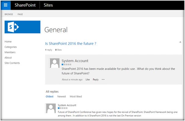 SharePoint 2016 comes with a Community Site template that helps the team hold a forum discussion. This site template was first introduced in SharePoint 2013 as an improved “Social Feature” so as to encourage open communication and information exchange. It also promotes active participation via reward system like badges and reputation. Community site comes as a Site Templateas well as a feature that can be activated in a normal team site. If we go to the site features section of a Community site we can view the Community Site Feature activated. How to create a Community Site We can create a community site from central administration by selecting the Community Site from the Site Templates section while creating the Site Collection. Add the site collection administrator and click on create. This will create the Site collection for you. We can start new discussion by clicking on new discussion button. This will navigate to the discussion post creation page. Here we can create a new discussion post and give details about the discussion intended. Once the discussion is created it will appear in the home page. Site users can now click on relevant discussion and add their replies and views. You can also Like the replies and posts. Now we have forum where multiple discussions can be hosted. Community site also provides options to generate community badges, reputation and categories which will enhance the community experience. Members usually gain reputation points by creating posts, replying to a post and liking replies. This is a useful feature to get feedback from employees and for starting a discussion on a topic. There are multiple use cases for a community site which we will explore later. Summarizing, SharePoint helps to maintain a forum within the intranet for organizational discussions using Community Site. In the upcoming articles we will see how to implement multiple use cases using Community site and explore in deep the social features associated with it.