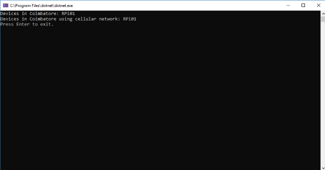 Here we query the device twins store in the IoT Hub to select devices located in Coimbatore and then reported a cellular connection.
