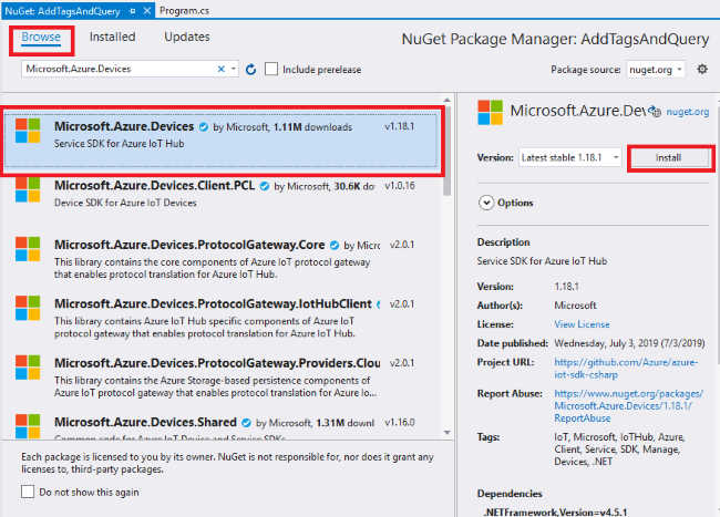 In the NuGet Package Manager, click the Browse tab and search Microsoft.Azure.Devices, and select Install.