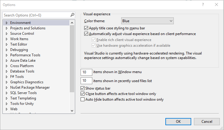 Open Visual Studio 2017. Go to Tools menu, point to options and click options, options window will open as shown below