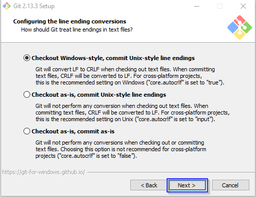 You can continue the default option for Checkout Windows-style, commit Unix-style line endings, click Next button.