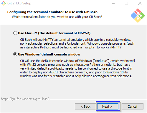You can select the option for use Windows default console window, click Next button.